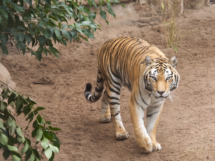 Caption: The tiger spots the mostly hairless primates taking pictures